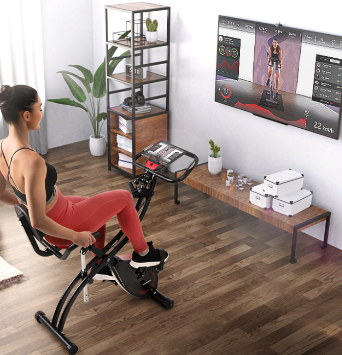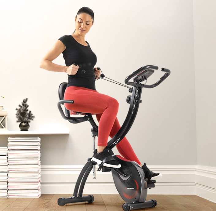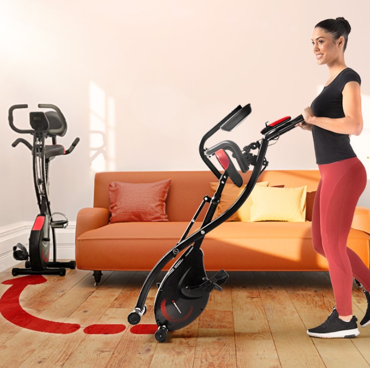 - PLIABLE, GAIN D'ESPACE : Vélo d'appartement Fitness pliable pour un gain de place de rangement si inutilisation. Et 2 roulettes intégrées pour mobilité accrue si besoin de le déplacer. Dim. dépliées : 43L x 97I x 109H cm ; - Dim. pliées : 43L x 56I x 129H cm ; - Charge max. recommandée : 110 kg