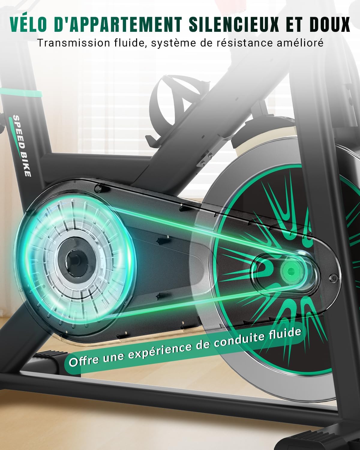 Le vélo d’appartement allie robustesse et confort grâce à sa construction en acier et aluminium. Son guidon ergonomique assure une prise sûre même lors des entraînements les plus intenses. Son design moderne noir et vert s’intègre harmonieusement dans toute maison ou salle de sport, et convient aussi bien aux débutants qu’aux utilisateurs avancés.
