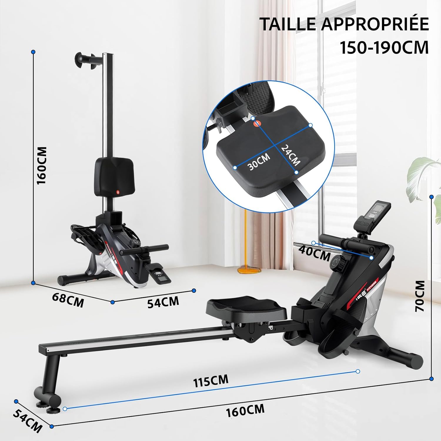 Grâce à son design compact et pliable, ce rameur est facile à ranger et idéal pour les appartements. Il se replie rapidement et dispose de roulettes de transport pour un déplacement sans effort. Dimensions totales : 156 × 55 × 70 cm. La position du siège est réglable et convient aux utilisateurs mesurant entre 1,50 m et 1,90 m.