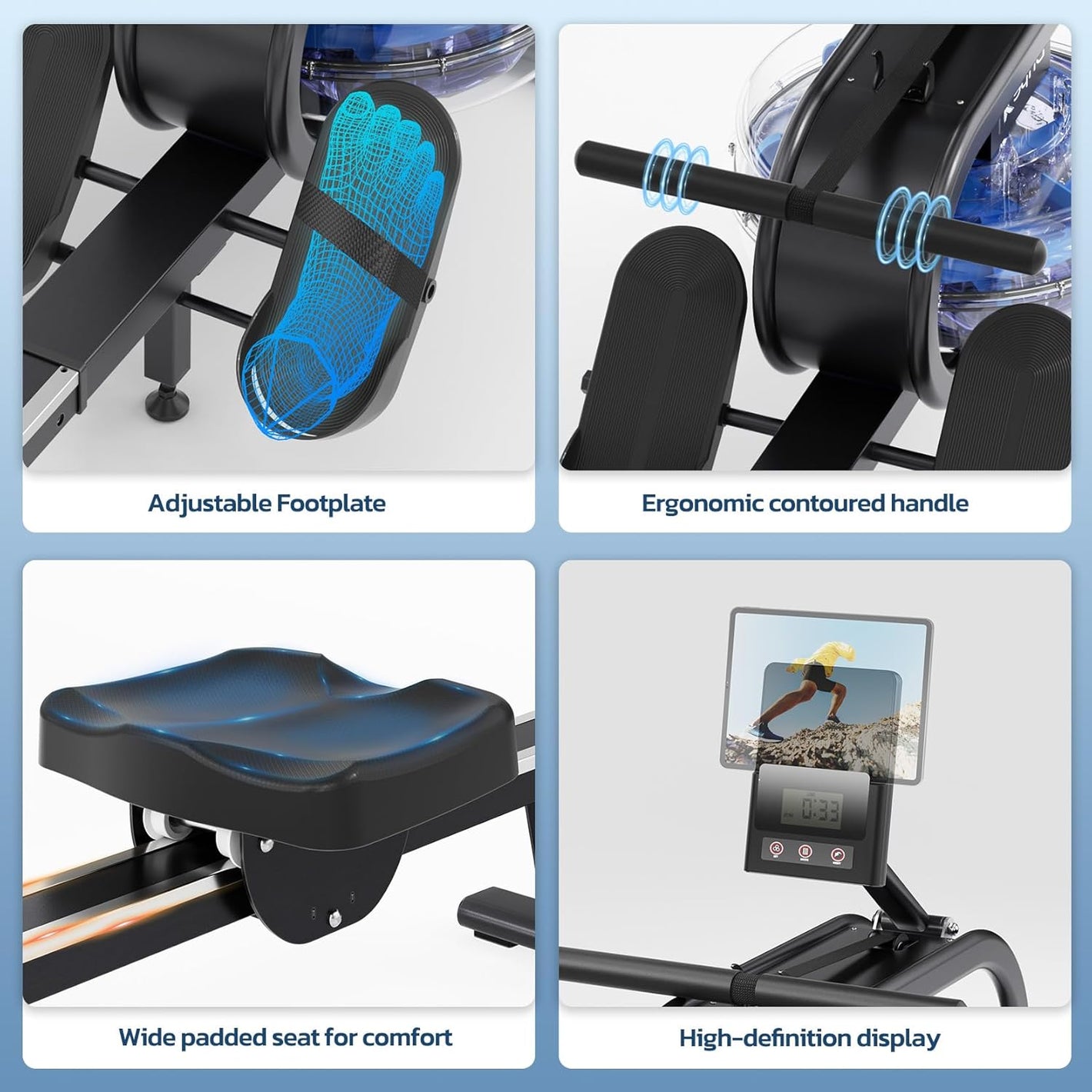 La selle ergonomique garantit une position assise confortable et naturelle. Le rameur est équipé d’un système de poulies mobiles, d’un siège confortable et d’une structure spécialement conçue pour les petits espaces. Son cadre en acier ultra-stable et ses rails en aluminium de haute qualité assurent solidité et durabilité. L’assise et les bras sont réglables pour une posture optimale, tandis que les repose-pieds avec sangles Velcro offrent un maintien sécurisé pendant l’entraînement.