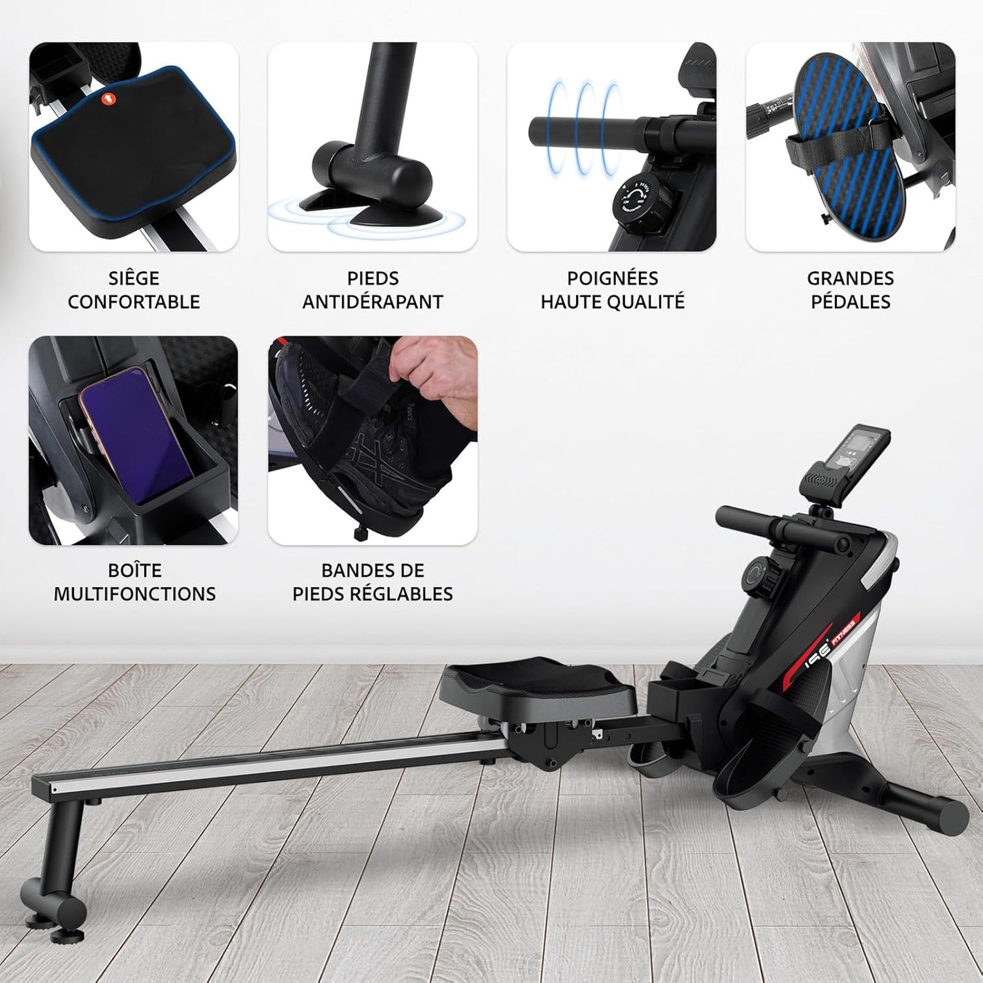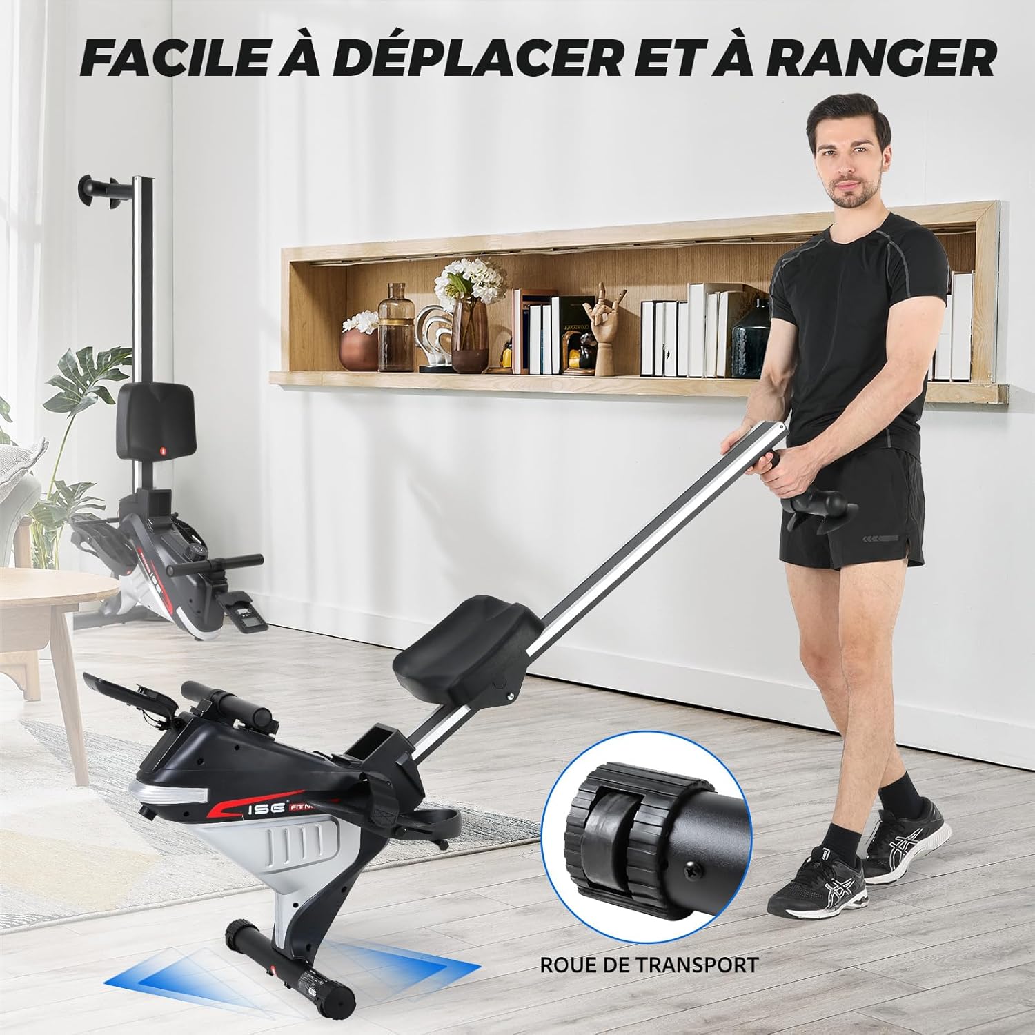Ce rameur d’appartement silencieux est doté d’un système de tirage fluide et discret, ainsi que d’un écran LCD affichant le temps, les coups par minute, le nombre total de coups, les coups par séance, les calories brûlées et la fonction SCAN. Véritable appareil de cardio-training, il sollicite l’ensemble du corps — notamment les bras, les épaules, les jambes et les hanches — et permet d’activer jusqu’à 60 % des muscles.