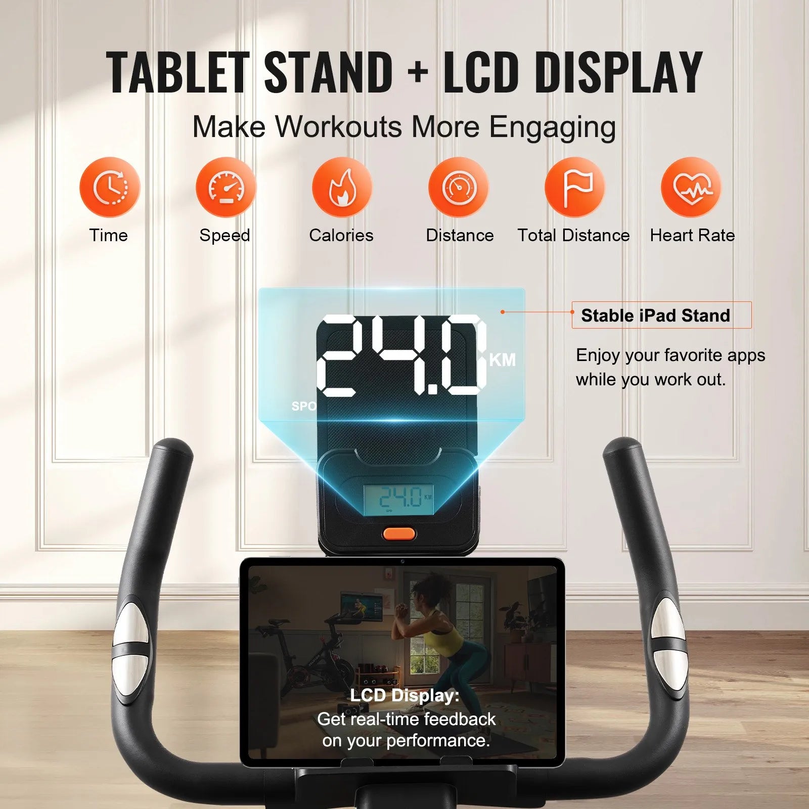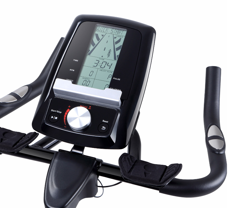 Ce vélo d’intérieur est conçu avec un cadre en acier au carbone offrant stabilité et sécurité. Il dispose d’un système de résistance magnétique réglable pour personnaliser l’intensité de l’entraînement, ainsi que d’un siège ventilé confortable pour rester au frais pendant les longues séances. Les positions de conduite ajustables s’adaptent à différentes tailles, assurant une expérience ergonomique et agréable. L’écran LCD intégré suit vos données d’entraînement en temps réel, et les roulettes facilitent le déplacement du vélo.